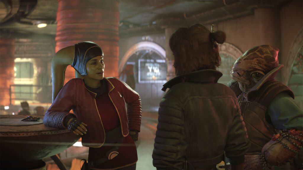And that’s a good thing, as the actual gameplay of Outlaws starts to outstay its welcome and wouldn’t hold up to a massive 100 hour adventure, as gameplay boils down to either Assassins Creed-like stealth sections, Uncharted-like climbing/exploring sections, or surprisingly competent space combat sections that vaguely reminds me of the excellent and oft-overlooked Star Wars Squadrons released by EA back in 2019. Gunplay makes the unusual choice of only giving you Kay’s customizable default blaster, other weapons are only offered as temporary “power-ups” that are disposed of when ammo is expended, not exactly canon-friendly. Not to say any of the gameplay is bad, it’s all done competently, but you do start to feel fatigue as you find yourself once again breaking into yet another imperial base or having to outrun a gang of speederbike thugs for the sixth time. And at the very least, the game delivers both a hacking and a locking mini-game that I didn’t hate. Also, the aforementioned Sabbac, which is probably the best interpretation of the infamous Star Wars card game that I’ve seen yet.